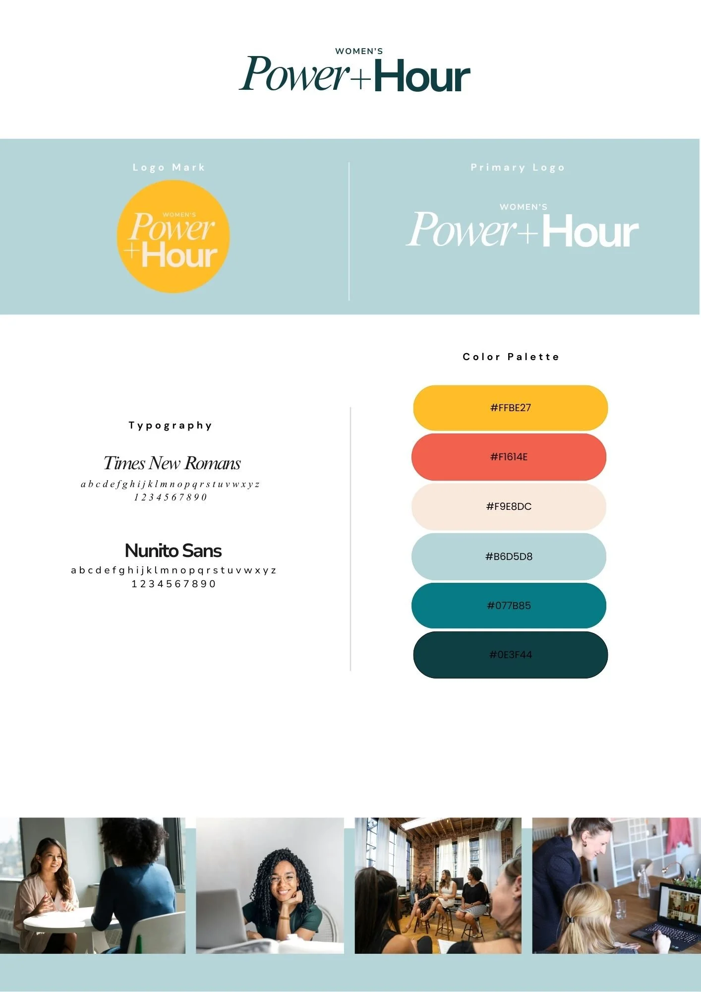 This brand guide was created for a women’s entrepreneurship group that meets weekly for one-hour sessions focused on skill-building, networking, and personal growth. The goal was to develop a vibrant, professional visual identity that reflects the group’s values—respect for time, meaningful connection, and delivering value to every participant.
